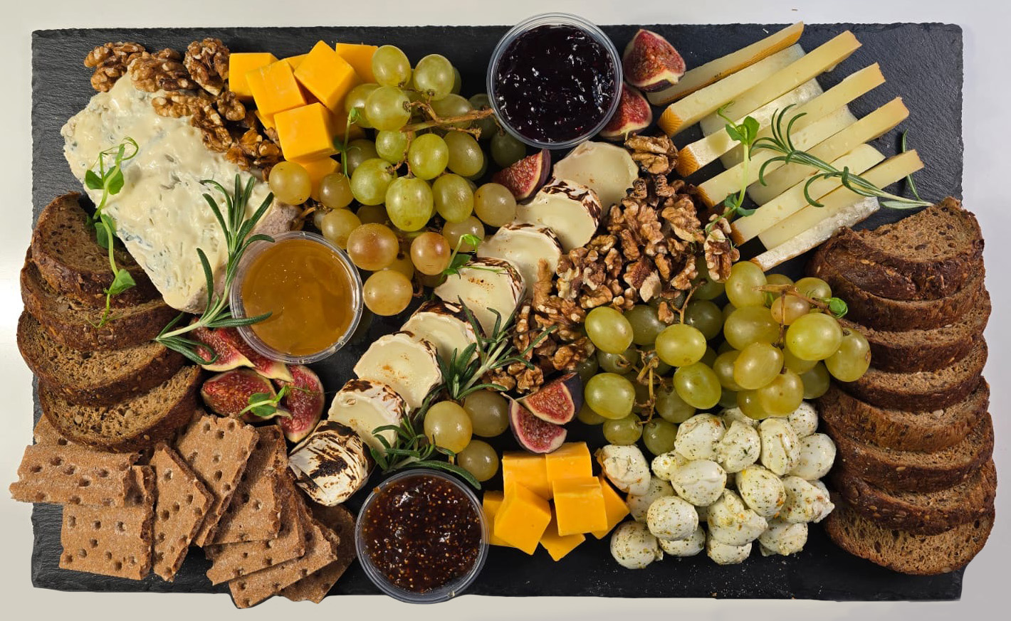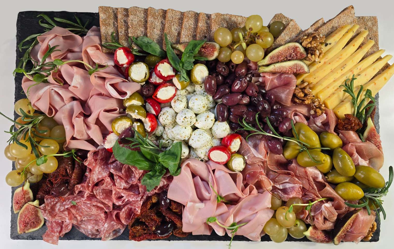 Selekcia výberových kravských, ovčích syrov, šuniek a salám, hrozno, mix olív, čerstvé figy, sušené paradajky, celozrnné krekry